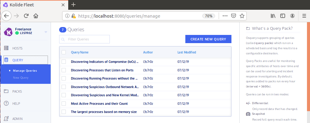 In this article, we have discussed the various capabilities of Kolide in managing a fleet of osquery hosts within the network. Threat hunters are able to issue create multiple commands and run them against multiple hosts within the network. Even though we have not discussed query packs, it is important to note that Kolide provides this function.