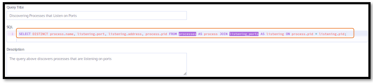 SELECT DISTINCT process.name, listening.port, listening.address, process.pid FROM processes AS process JOIN listening_ports AS listening ON process.pid = listening.pid;