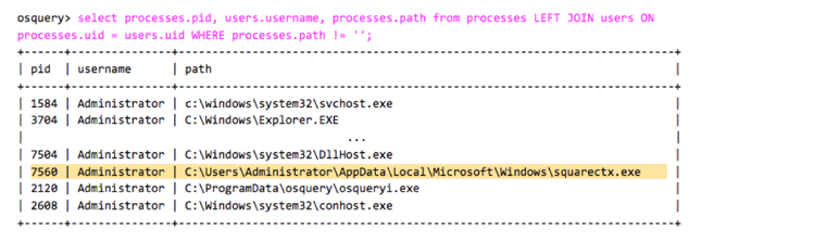 select processes.pid, users.username, processes.path from processes LEFT JOIN users ON processes.uid = users.uid WHERE processes.path != '';