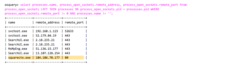 We can also use osquery to log socket connections for each process, performing network communications as shown below:
