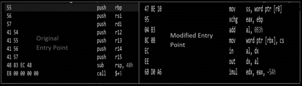 Ws2_32.dllBendyBear uses polymorphic code and its footprint changes during the code execution to avoid forensics and memory analysis and thus evading signature. Figure 2 below shows an example of the shellcode main entry point before and during runtime execution.