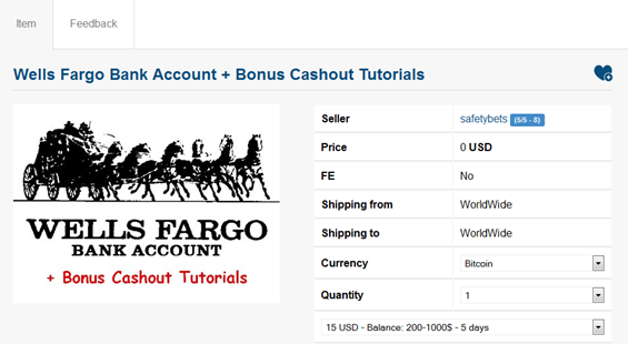 It is easy to find bank logins in black markets such as the Nucleus Market (http://nucleuspf3izq7o6.onion). In the following image a seller is offering a Wells Fargo bank account with a balance ranging from $200-1000 for $15 USD.