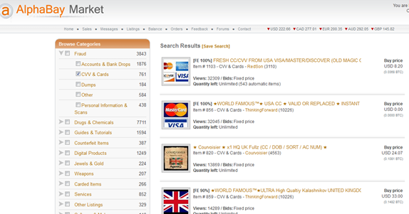 In the above table the attribute "Card Fraud Listing %" indicate the percentage of card fraud products respect the overall products offered on the black market. AlphaBay appears to be one of the best marketplace where to buy credit fraud products.