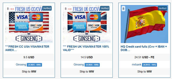 The majority of vendors offer credit card data related to US cards at very cheap prices, US CC CVVs go for $3 - $10; meanwhile US card DUMPs start from $15 and go up to $35. FULLZ data related to US card can reach $100 if it is offered with a high validity rate.