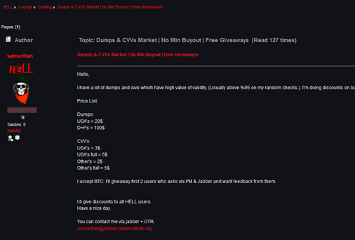 Another interesting underground community is "THE HELL" (hell2bjhfxm77htq.onion), is includes a carding section in which sellers offer any kind of product and services for card frauds.