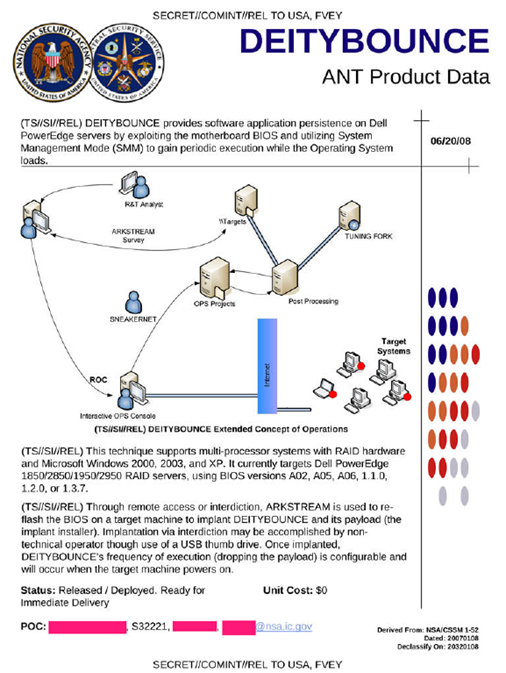 The tools mentioned in the introduction of this post specifically pointed out that Dell PowerEdge servers (1850, 2850, 1950, 2950) were all compromised. The NSA is able to exploit a feature in their architectures to serve a malware into the BIOS, either remote access or via USB drive.