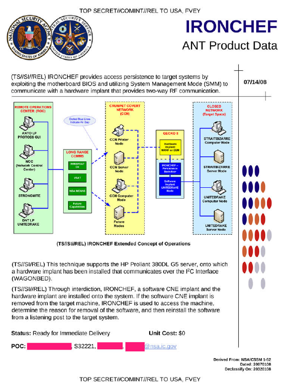 Like the tools DEITYBOUNCE and GODSURGE, the IRONCHEF provides persistent access to the target systems. IRONCHEF exploits the BIOS and utilizes the System Management Mode to communicate with a hardware implant that allows bidirectional RF communication.