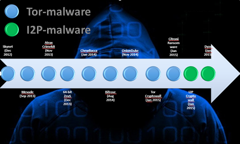 Security experts believe that malware authors will continue to exploit anonymizing networks like Tor and I2P. Analyzing the timeline of malware detections made by principal security firms, cyber criminals have been increasing the adoption of such networks since 2012.