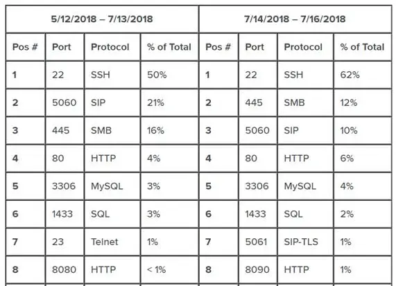 The SIP port 5060 was targeted 25 times more than Telnet port 23. Hackers were attempting to gain access to insecure communication systems or VoIP servers and compromise IoT devices to spy on communications. The number-two target was Telnet, suggesting that attackers were attempting to compromise IoT devices — likely to gain access to or listen in on targets of interest.