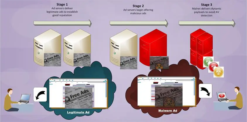Cyber-criminals offer the targeted publishers ad creatives that have a "clean" initial appearance and therefore can gain trust and a good reputation for an idle period. The ads appear normal on the outside, but they are "embedded with malicious code or JavaScript, often obfuscated to hide the actual code being executed or server calls being made." At a given point later, these "clean" ads are converted into sprinklers that spread viruses or spyware behind the facade (See Diagram 2). Essentially, attackers push through their malvertisements to legitimate users by using the good reputation of the websites under attack.