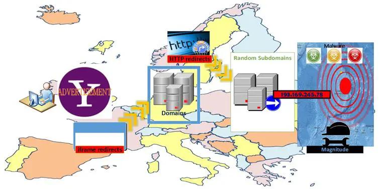 2) Upon visiting yahoo.com, users are redirected by those malvertisements first to one of the domains.