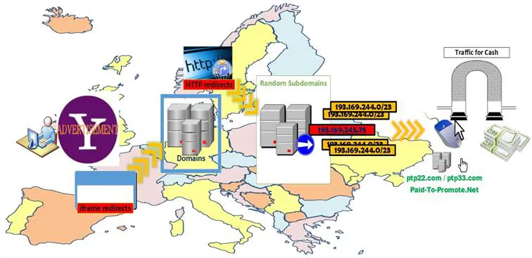 Jason Schultz, a threat research engineer with Cisco, attests that the IP address 193.169.245.78 associated with the Yahoo malvertising appears to be connected with other IP addresses within the 193.169.244.0/23 netblock. It seems likely that they have been utilized by the same entity. Instead of redirecting to a page armed with an exploit kit, Cisco reveals that an HTTP response code 302 actually sends users to domains ptp22.com or ptp33.com, which belong to an organization holding the unequivocal name Paid-To-Promote.Net (see Diagram 6), which pays "people fees to push traffic to other website." Everything seems crystal-clear, traffic monetizing might as well be the new money-laundering machine dressed up in a pseudo-legitimate form.