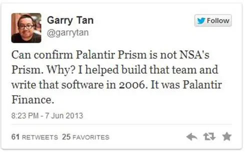 Personally I believe that the system Palantir PRISM isn't the same solution used by the US Government to analyze real time billions of records obtained by intercepting any kind of information, at the same time I think that Palantir is one of most valid companies in the US able to provide solutions necessary to conduct so complex analysis.
