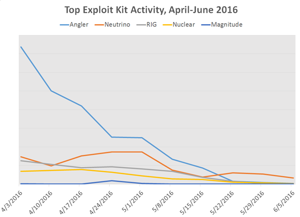 Figure 5 - Top Exploit Kit Activity, April - June 2016 (Proofpoint)