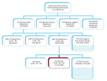 The number 61398 is the division's Military Unit Cover Designator (MUCD). These five digit identifiers are given to the various sub-divisions of the PLA. The following figure visually depicts the organizational hierarchy of the PLA within the Chinese Communist Party.