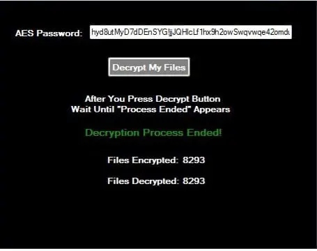 The Ransomware Decrypter is shown in the next figure. This is used by the victims to decrypt files with the key sent by the criminals once they have paid the ransom. Pressing the "decrypt my files" button, the decryption process of files starts.