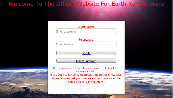Another RaaS platform is earthRansomware. The following image shows the home page of the site. Customers can log in to the platform after buying their personal ransomware by contacting the EarthRansomware team by email.