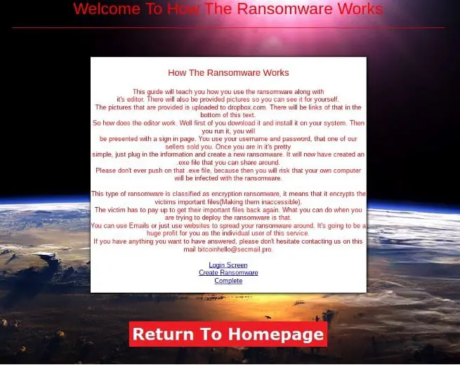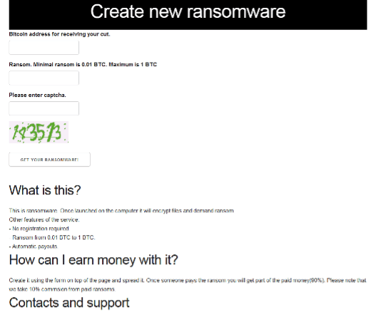 A totally-free platform found in the darknet is Createyourownransomware; its website allows users to download ready-to-go ransomware by filling only the boxes in a form: