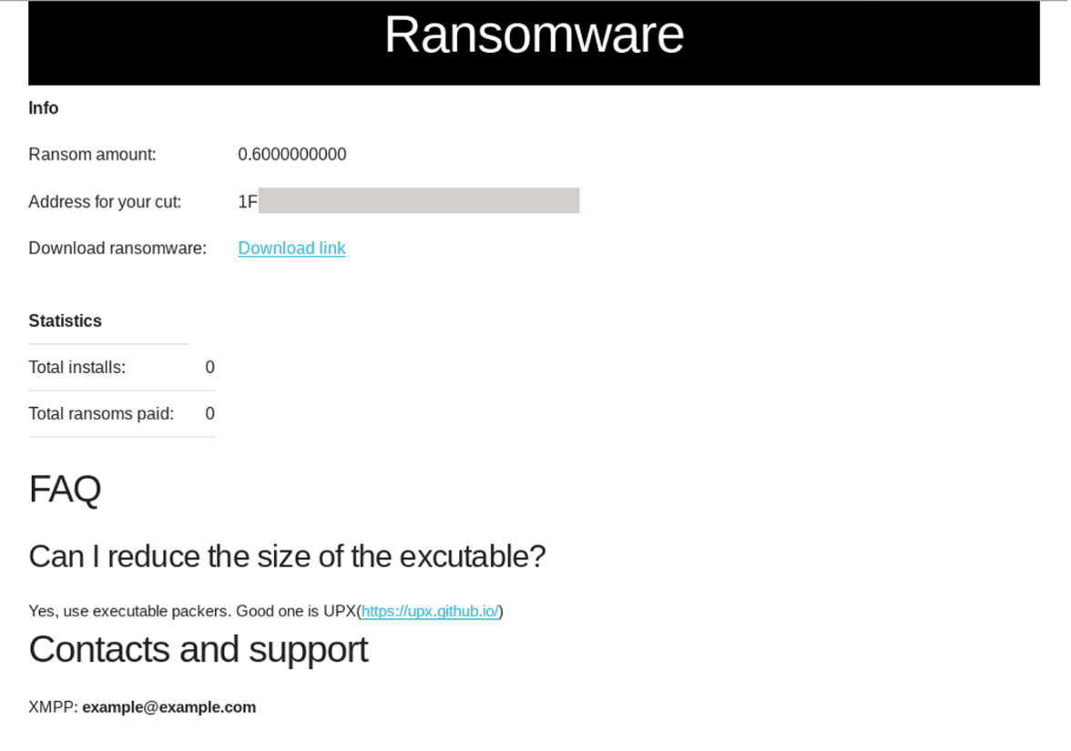Once the users have filled out the form, the platform will instantly build a new sample and show the link to download the malware. Furthermore, a second webpage shows some statistics about the ransomware campaign, such as the number of infected machines and the number of the paid ransoms.