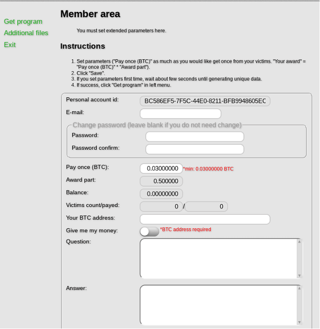 A set of statistics about the ransomware campaign, keeping track of the number of infections, the number of paying people and the relative monetary earnings are available in the user's personal section.
