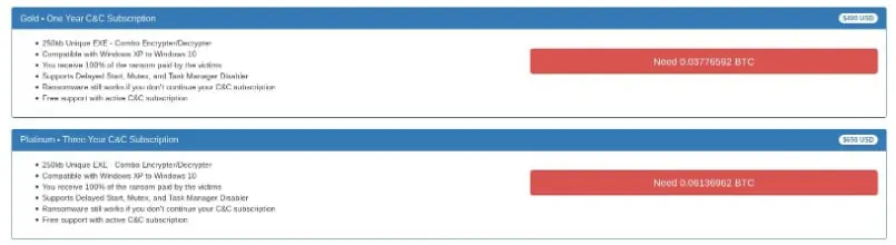 In this dashboard, users can purchase new packages that include, for each plan, the same ransomware but a different subscription time to the Command and Control. As shown in the next figure, there are two plans in which the ransomware is the same, but there is a different subscription time to the COMMAND AND CONTROL dashboard, with different prices.