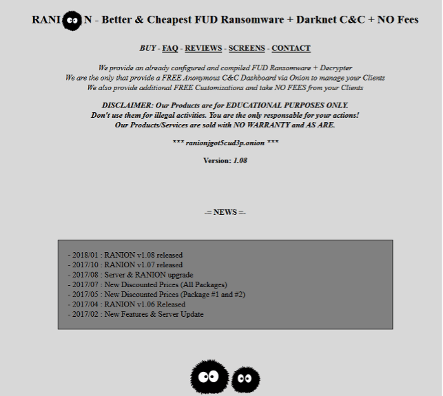 Another platform that offers a similar service is Ranion. The novelty is that the Ranion team declares that the COMMAND AND CONTROL of their "Fully UnDetectable" ransomware are established in the Darknet. This site is continuously updated by its operators.