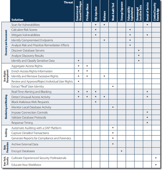 The adoption of a multi-layered database security defense strategy is strongly suggested; the adoption of best practices and the implementation of internal controls could sensibly reduce the risk for data exposure caused by various attack vectors. The matrix below identifies solutions for each of the top 10 database threats proposed by Imperva in its last study: