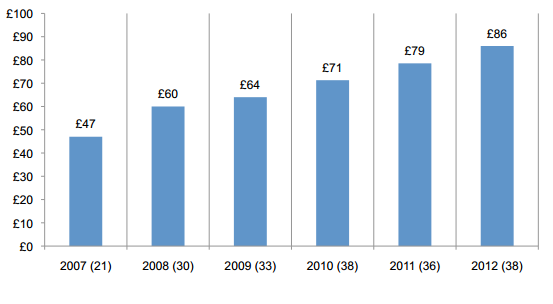 Lost business cost has nearly doubled over the last six years, also ex-poste response and detection costs (e.g., activities that attempt to address victims', regulators', and plaintiff counsels' concerns about the breach incident, legal and consulting fees that attempt to reduce business risk and liability) increased from approximately £451 thousand in 2011 to £508 thousand in 2012..