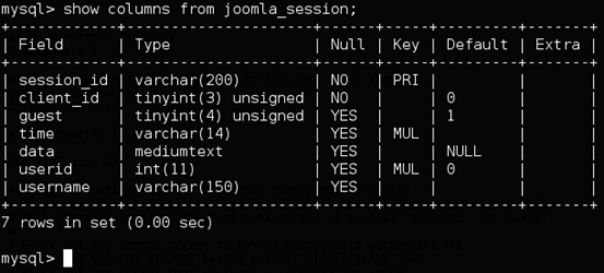 The above figure shows the column names of the "joomla_session" table. "data" is what we are interested in.