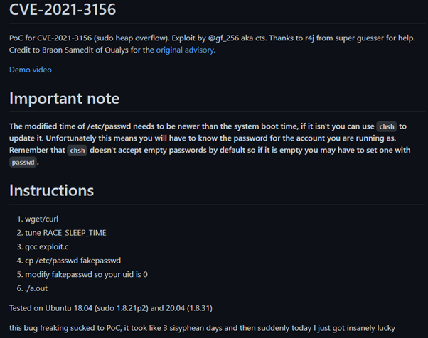 A recent vulnerability tracked as CVE-2021-3156 in Sudo, a powerful utility used on any standard Linux installation, could allow unprivileged local users to gain root privileges on a vulnerable host. This flaw needs no authentication and is based on a heap buffer overflow in Sudo legacy versions 1.8.2 to 1.8.31p2 and all stable versions (1.9.0 to 1.9.5p1).