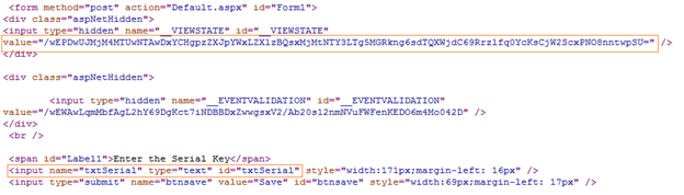 The following example is just storing serial key values into page View-State for further reference. If an attacker inspects the HTML page source, he can find the following View-State information in the hidden field like so: