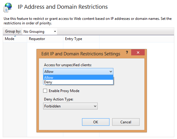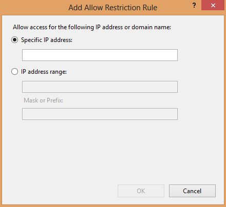 IP restriction enables you to selectively allow or deny access to the files, folder, website, and web server. Overall, the administrator has the autonomy to determine which remote computer can connect to IIS. Custom rules can be built in context of a particular client, or DNS lookup to provision their restriction. A vulnerability of ASP.NET would allow a hacker to potentially bypass any restriction code into your application before your code has a change to run. When a client who is not permitted access requests a resource, a 'Forbidden: IP address of the client has been rejected (403.6)' or 'DNS name of the client is rejected (403.8)' HTTP status will be reflected and logged. Moreover, there are two terms introduced by IIS in this scenario: IP and Domain Restriction.