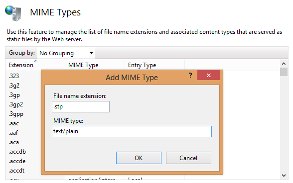 MIME prevents undefined file types from being hosted by IIS, protecting the web server by shielding vicious attackers from downloading sensitive files. Although configuration files and data files would not typically be stored within the web root folder, when a hacker tries to download a file that does not have a defined type, a 404.3 HTTP status is issued by IIS, as well as recorded in the log file. If you have a custom file extension that needs to be downloadable by clients, you will need to add a new MIME type as follows.