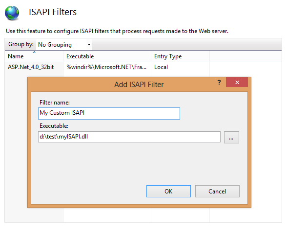 IIS introduces the server side administration to configure what ISAPI extension is permitted to run on the server. IIS allows each ISAPI extension to be set to an allowed or disallowed state. Further, it logs and generates a 404.2 HTTP status for a disallowed malicious extension, because hackers can implant malicious viruses into the server remote file intrusion attack. Configuring additional ISAPI extensions requires taking further steps to ensure the ongoing security of your server. To add a new ISAPI extension, enter the DLL path and custom name as follows.