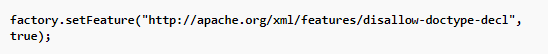 DocumentBuilderFactory, SAXParserFactory and DOM4J XML Parsers can all be configured by utilizing the same techniques as seen in previous examples against XXE. Only the DocumentBuilderFactory example is shown below as an image.