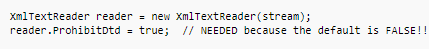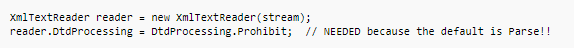 In .NET Framework version 4.0, DTD parsing behavior was changed. The ProhibitDtd property was deprecated for the new DtdProcessing property. But this has not necessarily solved the default insecurity because they didn't change the default settings, meaning that XmlTextReader is still vulnerable to XXE upon installing it. If you set DtdProcessing to Prohibit, it will cause the runtime to throw an exception if a <!DOCTYPE> element is present in the XML. To set this value manually you must use the following: