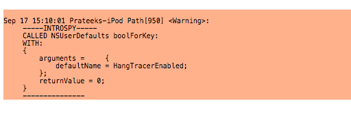 But probably the most interesting piece of information can be found from the image below. As you can see, the app is checking NSUserDefaults for a bool value HangTracerEnabled. This could have been a check to see if the the app is being traced during runtime and if so, quit the app. However, this technique seems to fail currently as it not able to detect the Introspy analyzer. But when i ran Snoop-it to analyze the Path application, it crashed. So this bool value definitely seems to be a check to determine whether tracing is being enabled or not. We will look up this concept in later articles.