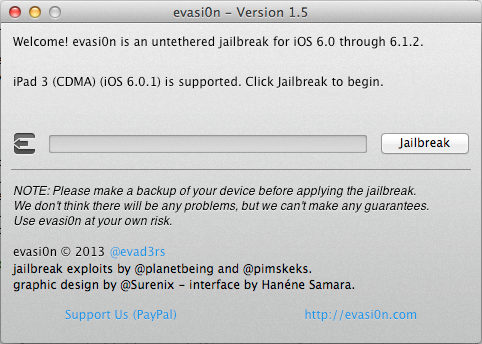 In this case, i am going to jailbreak my new Ipad (3rd generation) running IOS 6.0.1. Once you download evasi0n and run it, you will see that it automatically detects the device and tells you if a jailbreak is available for it or not.