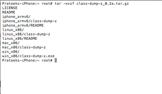 Once this is done, go inside the folder iphone_armv6 and copy the class-dump-z executable into /usr/bin directory. This will make sure you can run class-dump-z from anywhere on the device. Once you have copied the executable, just type class-dump-z. If you get the output as shown in the figure below, this means that class-dump-z has been successfully installed.