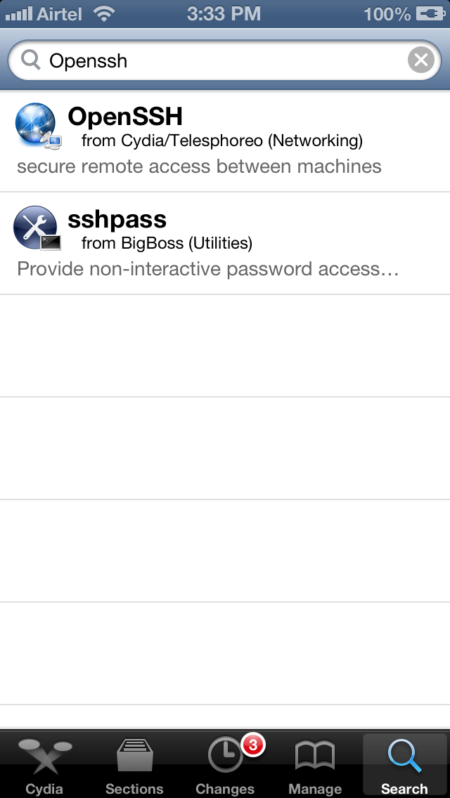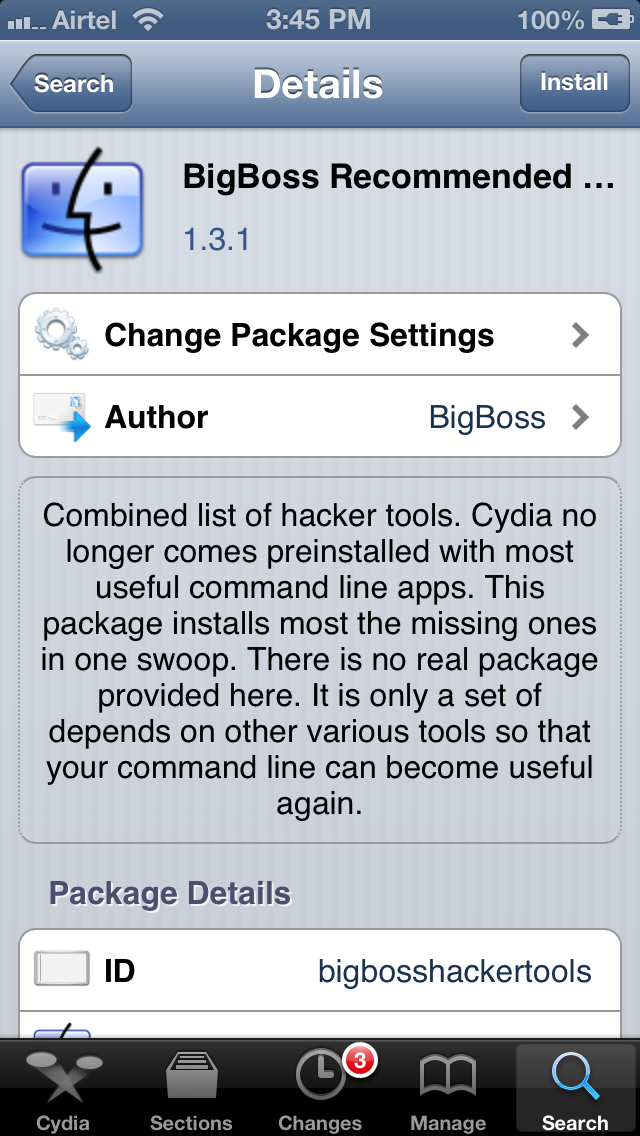 Before we use ssh to log in to the device, we should install some other command line tools also. Almost all the popular hacker tools can be installed by using the BigBoss Recommended tools package which comes with a list of hacker tools. To install BigBoss Recommended tools just search for it in Cydia and tap on install.