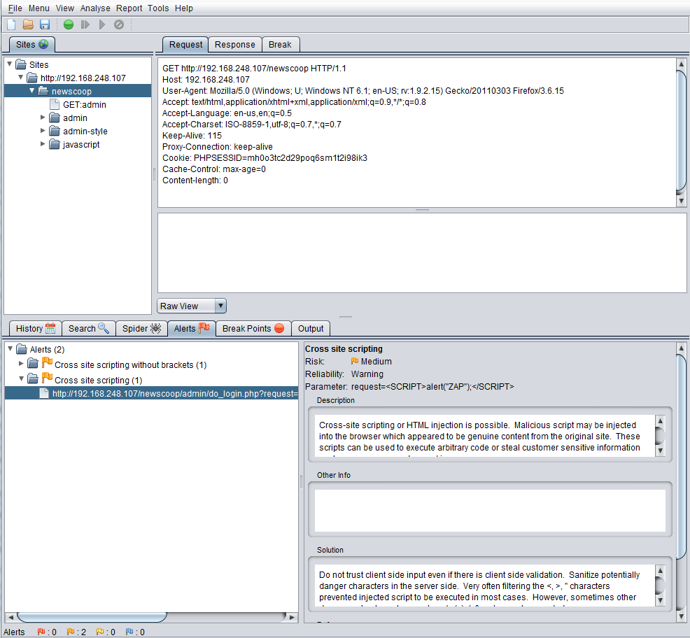 I pointed ZAP at my lab-installed version 3.5 of Newscoop, repaired in 3.5.1 after coordinated disclosure with the vendor.