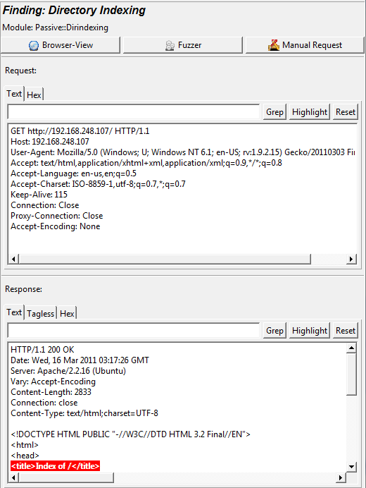 I used it against one of my lab servers that is intentionally vulnerable as intended for convenient, internal use only. As this would be the text book definition of security misconfiguration were it to be exposed to the Internet, I pointed Watobo at it for an "audit."