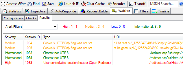 Watcher is Chris Weber's Fiddler add-on (IE only) and works incredible well as a passive analyzer. Also useful for spotting the above mentioned transport layer issues, Watcher also nabs open redirects and forwards should you be running Fiddler with Watcher as you browse. Once installed along with Fiddler using Watcher is as easy as ensuring that IE traffic proxied through Fiddler and that Watcher is enabled in Fiddler. Then browser your target site and interact; Watcher will monitor and alert passively as seen in Figure 9.