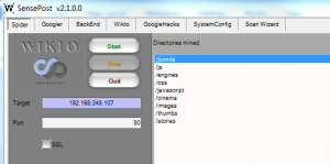Once installed Wikto can be initialized via the Wikto Scan Wizard which will walk you through Target Selection, Configuration (proxy server if applicable), Confirm Settings, and an Overview. Alternatively you can use each Wikto tab as you see fit. Start with Spider and establish your target IP in the Target window along with a port if not a standard HTTP/HTTPS port. Continuing on our Joomla theme from above (now testing an approved test server), note that the Wikto Spider mined directories typical to Joomla, including /joomla and /stories as seen in Figure 2.