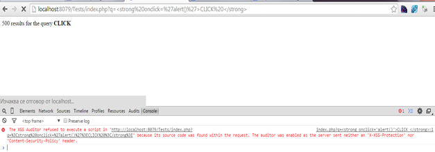 We get an error in the console telling us that the XSS Auditor did not execute the script on up to date Chrome, but this would not be necessarily the response all users will get.