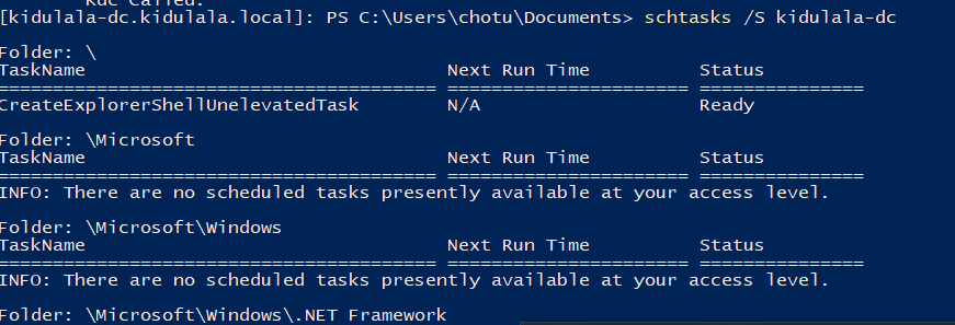 - As an example, we can run commands to list the scheduled tasks on the DC.
