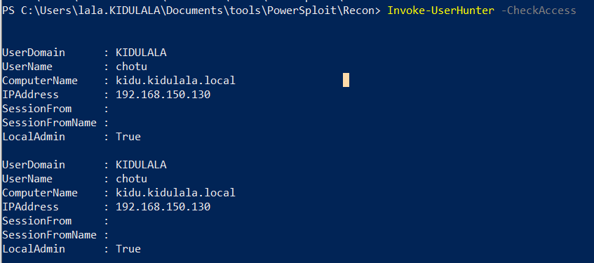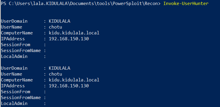 - Now we need to check if there is any machine where our current user has admin access and a domain session is active. We will use Invoke-Hunter for that. We got the server “kidu.kidulala.local” where the domain admin “chotu“ has a session.
